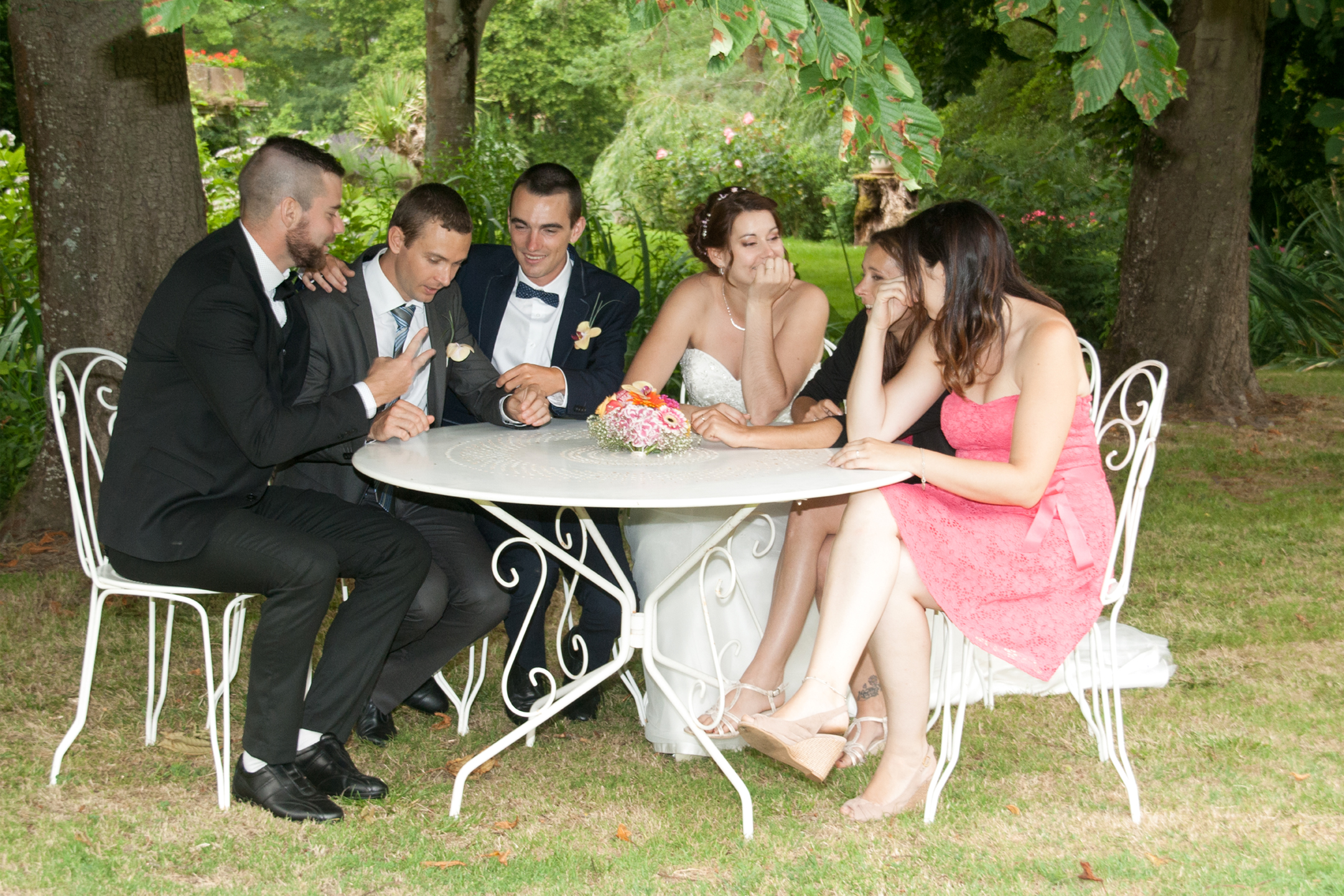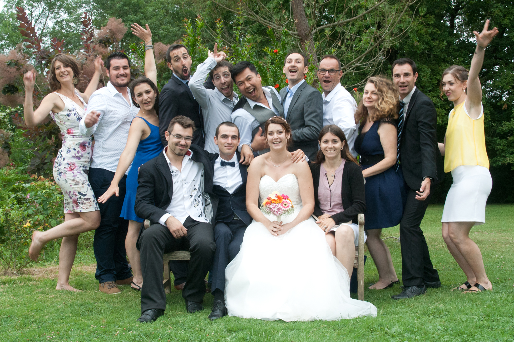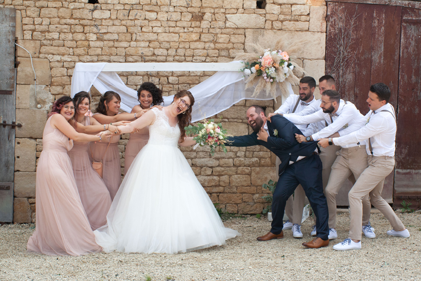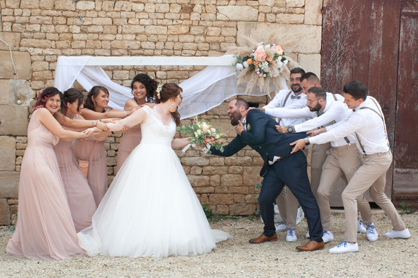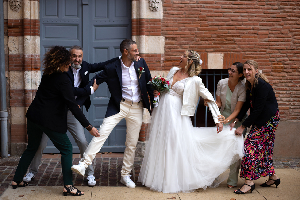 Je guide les groupes avec bienveillance, j’apporte du mouvement, des sourires sincères et parfois même des éclats de rire. L’objectif : créer des photos de groupe naturelles, pleines de vie, sans jamais casser l’ambiance de fête de votre journée de mariage.